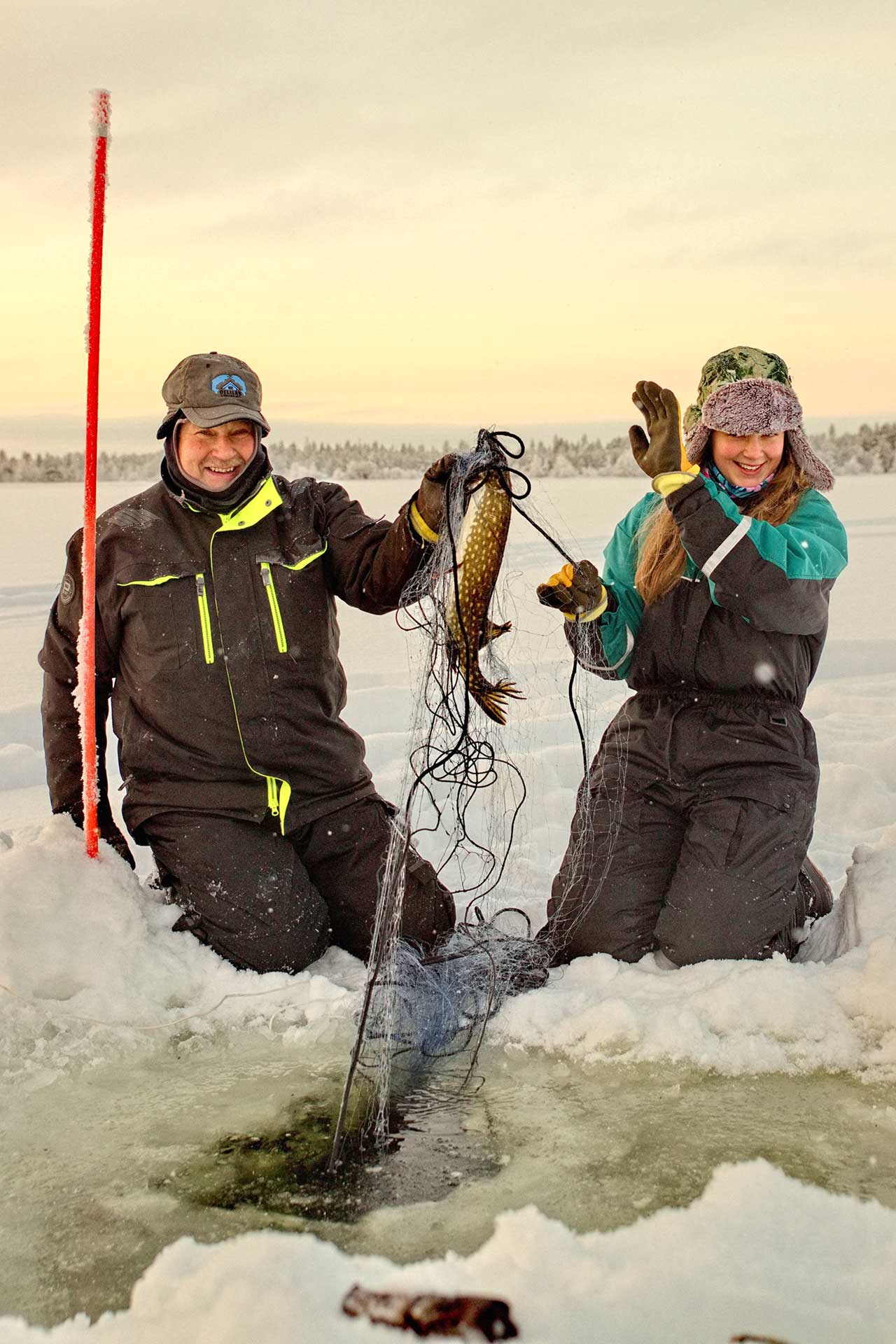 Ollila is located in Sossonniemi, which is a local historical fishing village. The fish populations in the local lakes are diverse and abundant. In our fishing program you will become part of the local fishing tradition by having a go at winter fishing with our professional fisherman. You can try your hand at both net fishing and ice fishing.